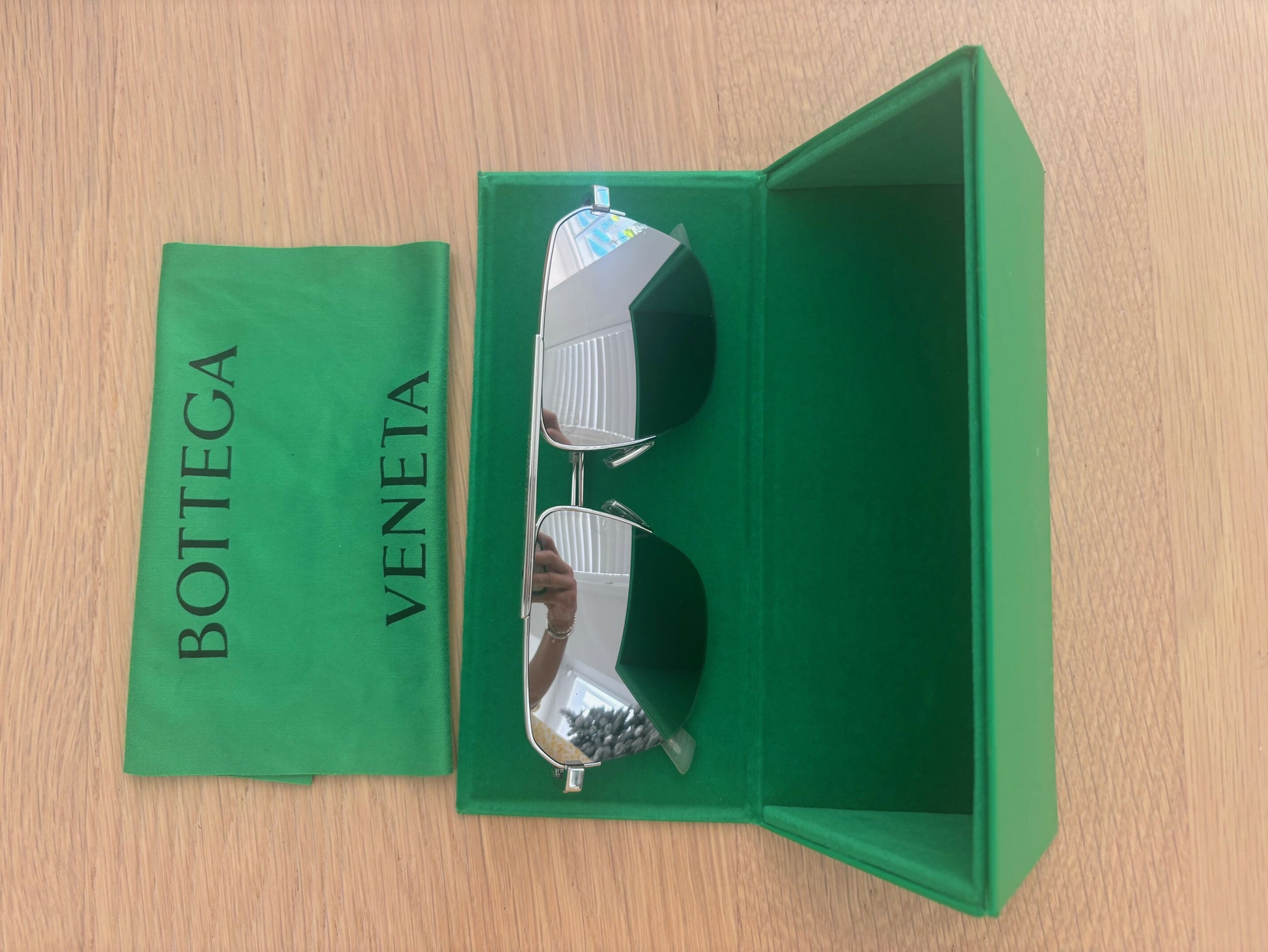 Bottega Veneta Square Aviator Sunglasses merge sleek, modern styling with luxury craftsmanship in a unisex silhouette that elevates any look. The design centers on a lightweight metal frame paired with striking silver mirrored lenses, delivering a bold, contemporary aesthetic.