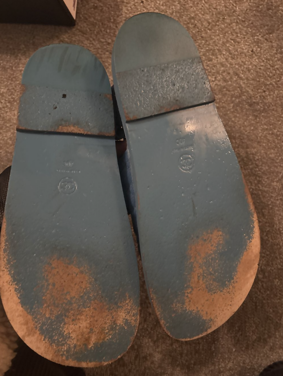 Chanel Dad sandals in blue suede with double C crest details. Worn twice. Slight wear on the sole as I tried to scuff them up for more grip - I would suggest getting a grippy sole added as they have a tendency to be slippery. Size 40/9. Comes with all original packaging (box, tissue, ribbon), authentication card, and proof of purchase. Paid $2,800 NZD ($2,650 AUD) for them brand new. My puppy got hold of the authentication card for a moment hence the teeth marks, everything is still in tact and legible inside the pouch.