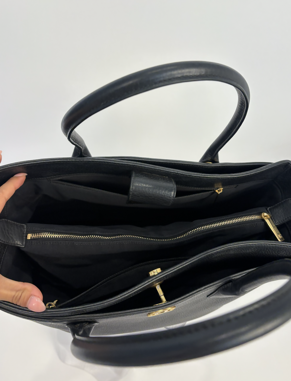 Gold-tone hardware accents the design with subtle luxury, while the dual top handles offers a versatile carrying option. Thoughtful interior compartments and a central zip pocket ensure organised, functional storage without compromising its chic silhouette.
