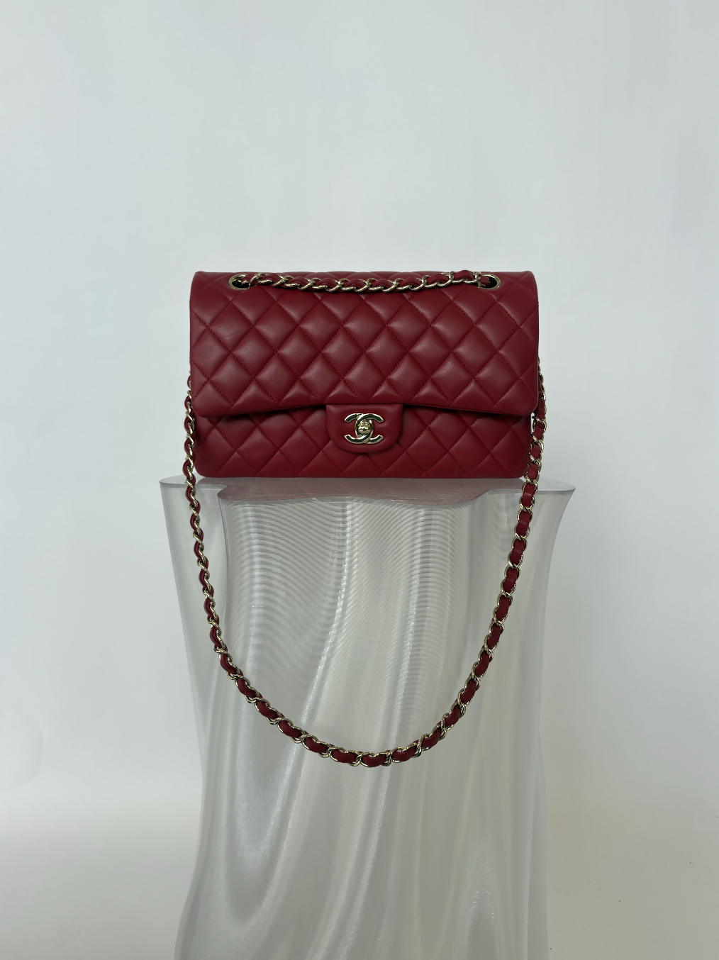 An iconic Chanel classic, this Medium Double Flap is crafted from luxurious red lambskin leather and finished with signature gold hardware. The timeless design features the interlocking CC turn-lock closure, chain-link shoulder strap, and dual interior compartments — a perfect blend of elegance and function.