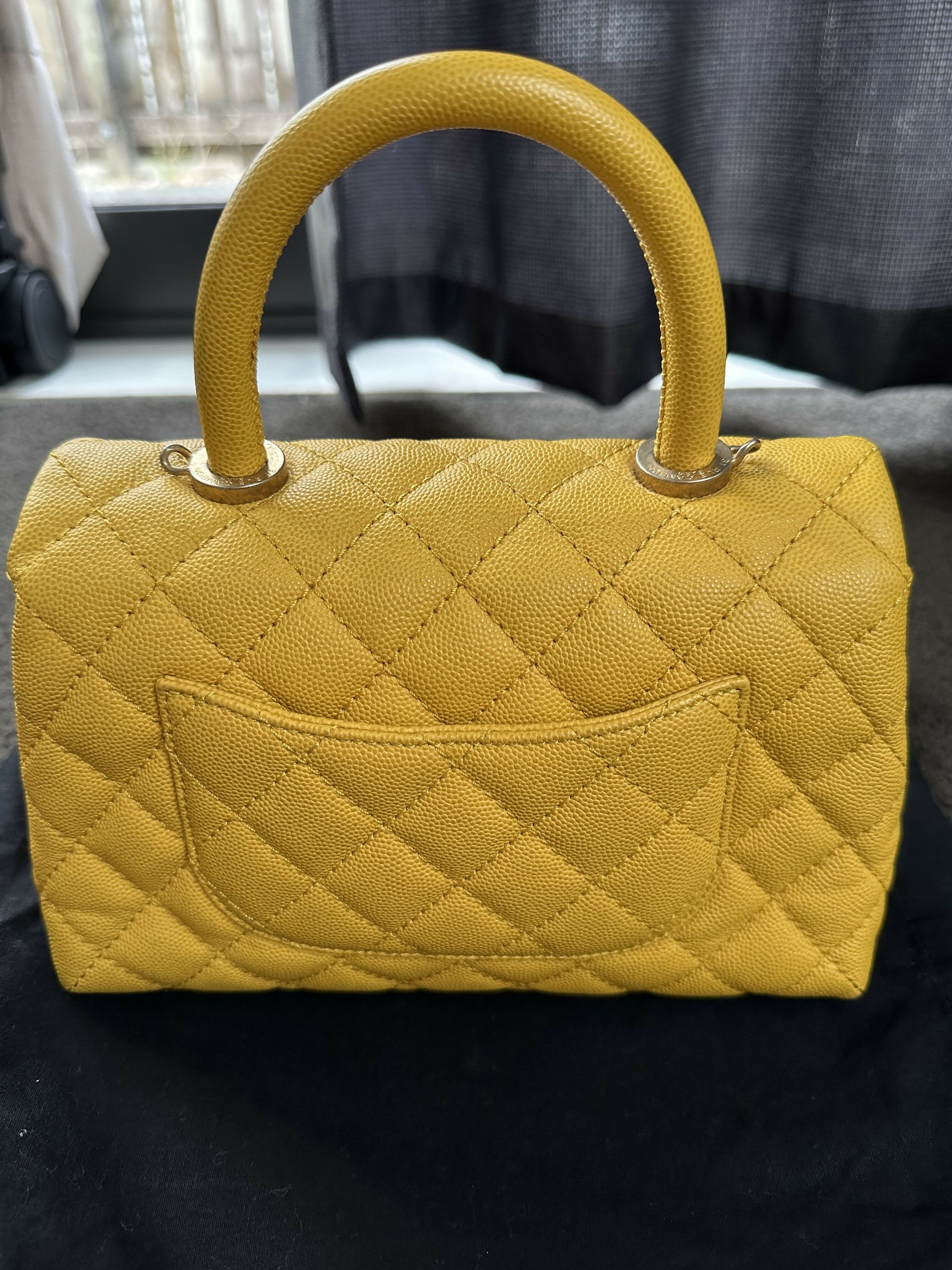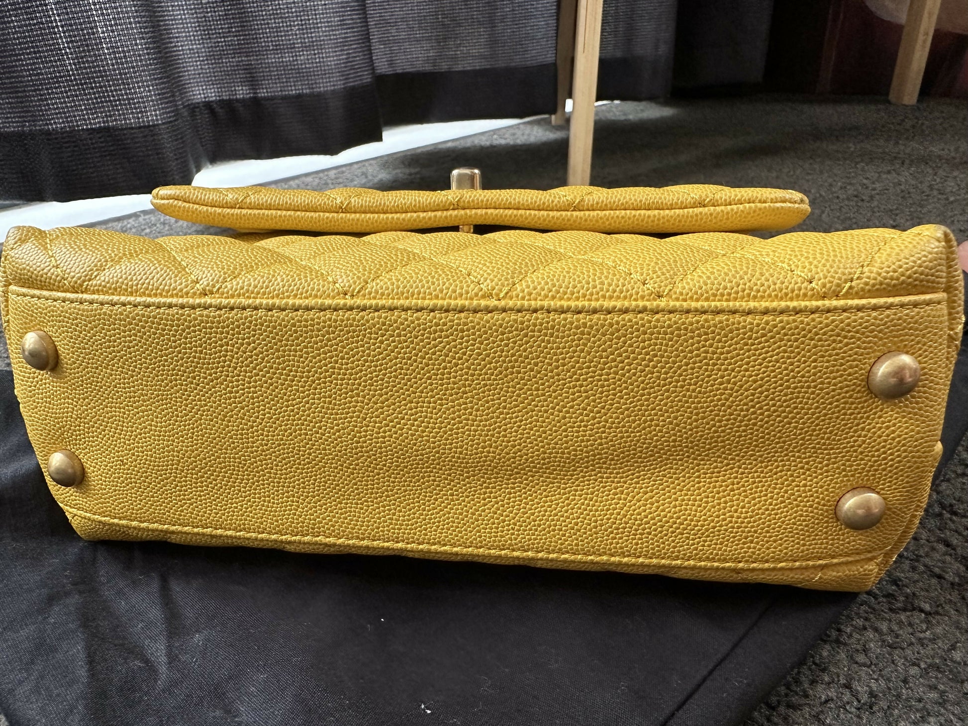 This is an authentic CHANEL Caviar Quilted Mini Coco Handle Flap in Yellow. This sleek classic tote is crafted of diamond quilted caviar leather in yellow.