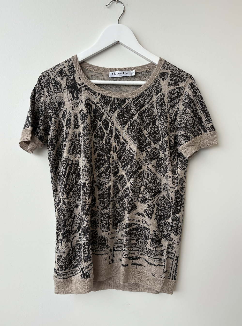 A collector’s favourite, the Christian Dior “Plan de Paris” Tee celebrates the maison’s heritage with an intricate map print of Paris — a poetic tribute to the city at the heart of Dior’s story. Crafted from a beautiful blend of linen, cashmere and silk, finished with subtle logo detailing, this piece balances casual elegance with couture-inspired artistry. A timeless wardrobe statement that captures the essence of modern femininity.