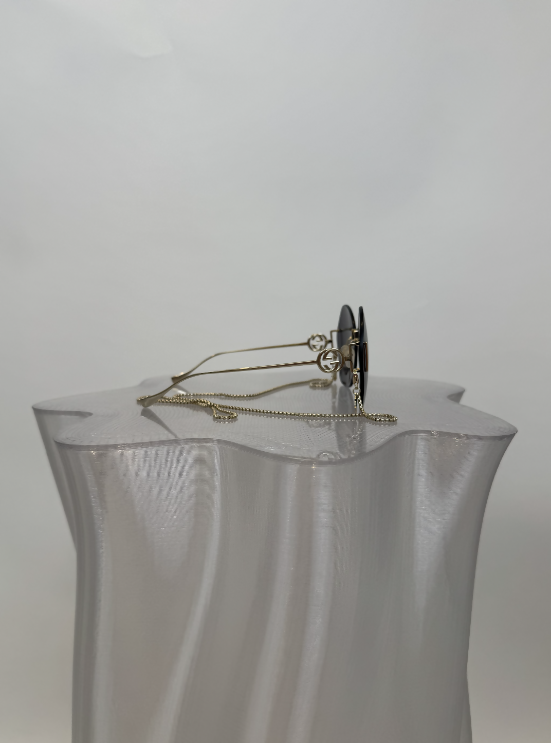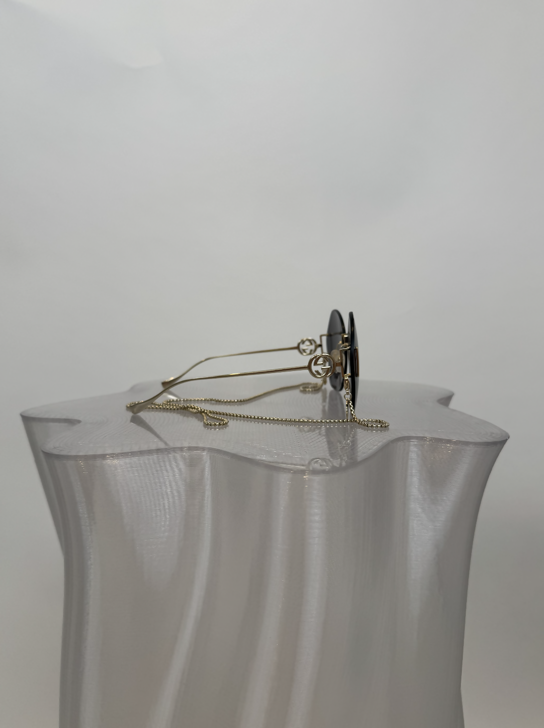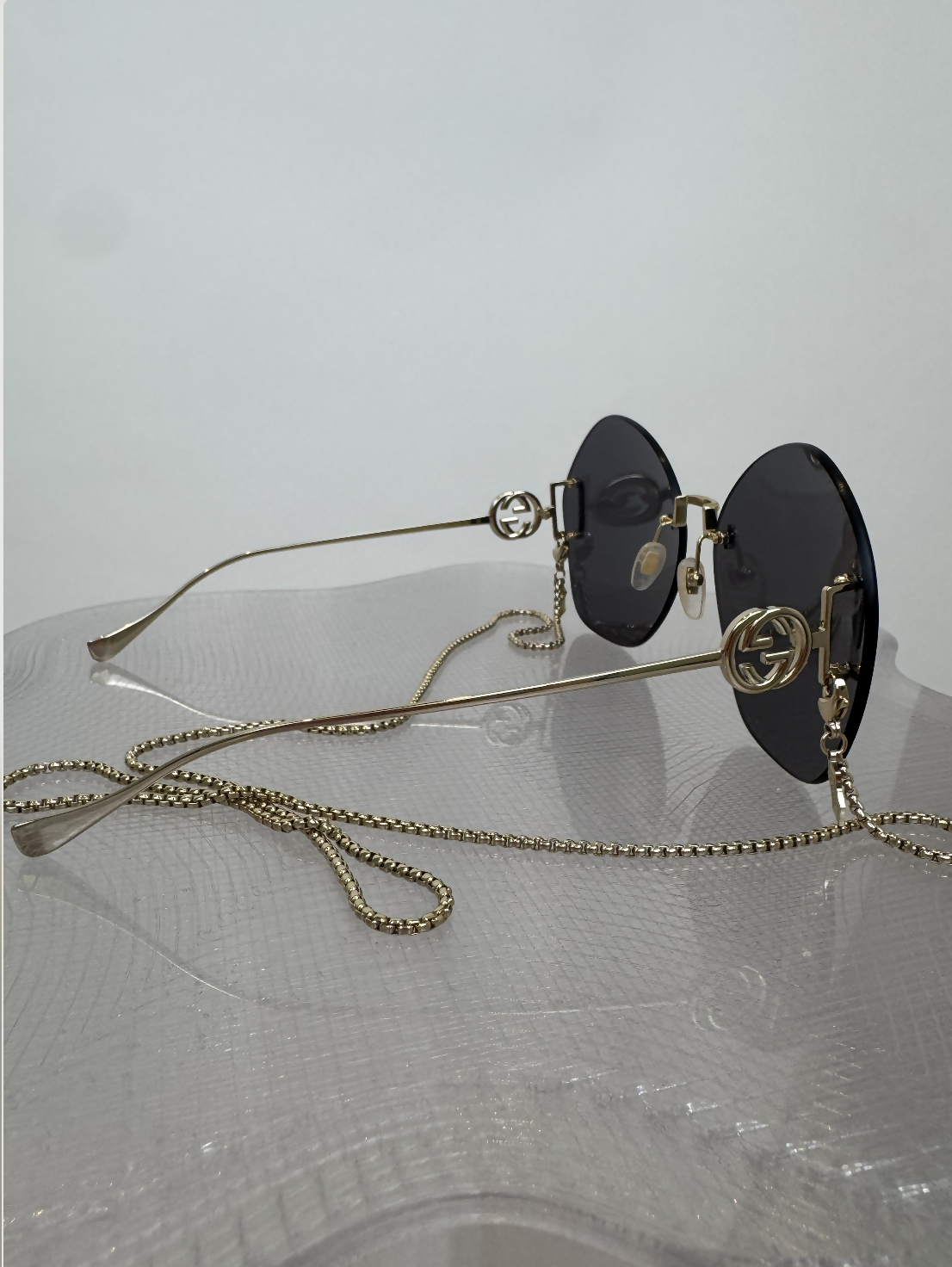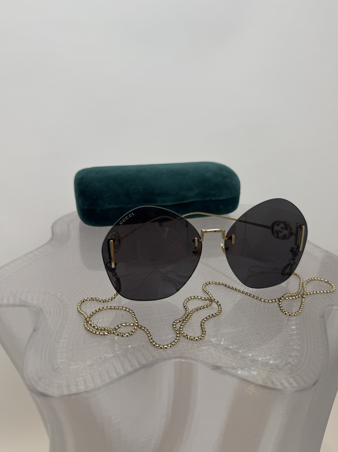 This pair is in great condition with no major signs of wear and no scratches on the lenses or frames. There is only a small amount of makeup residue on the nose pads, which does not affect wear. The sunglasses come complete with the original Gucci case and removable chain, making them a standout addition to any designer collection.