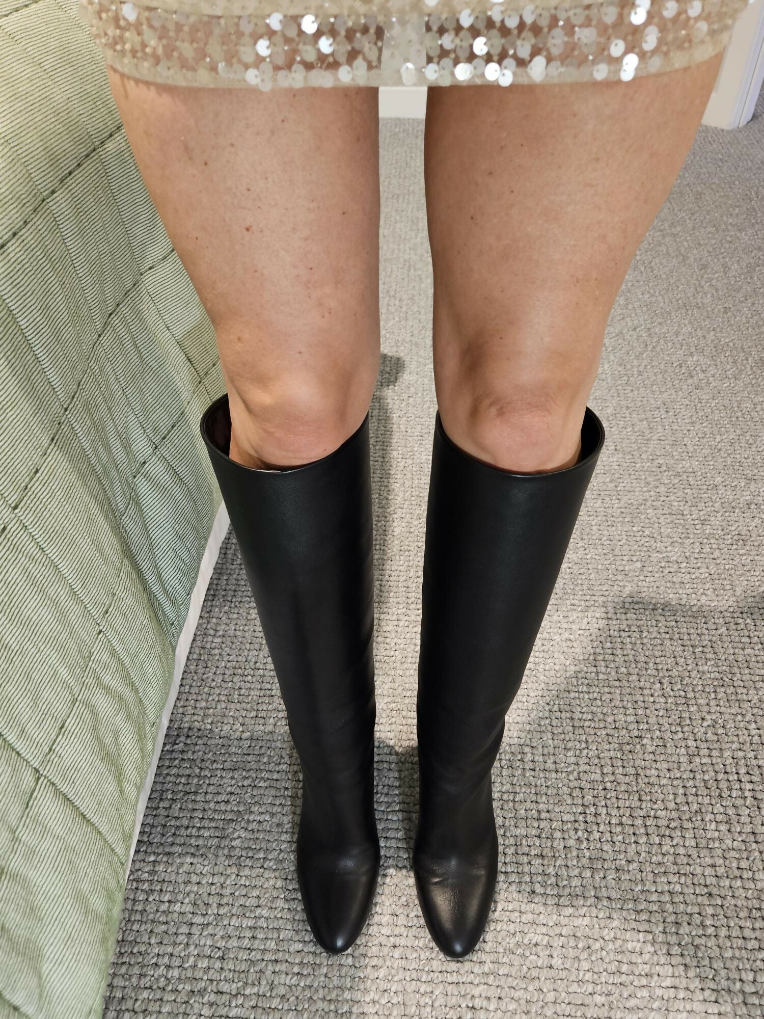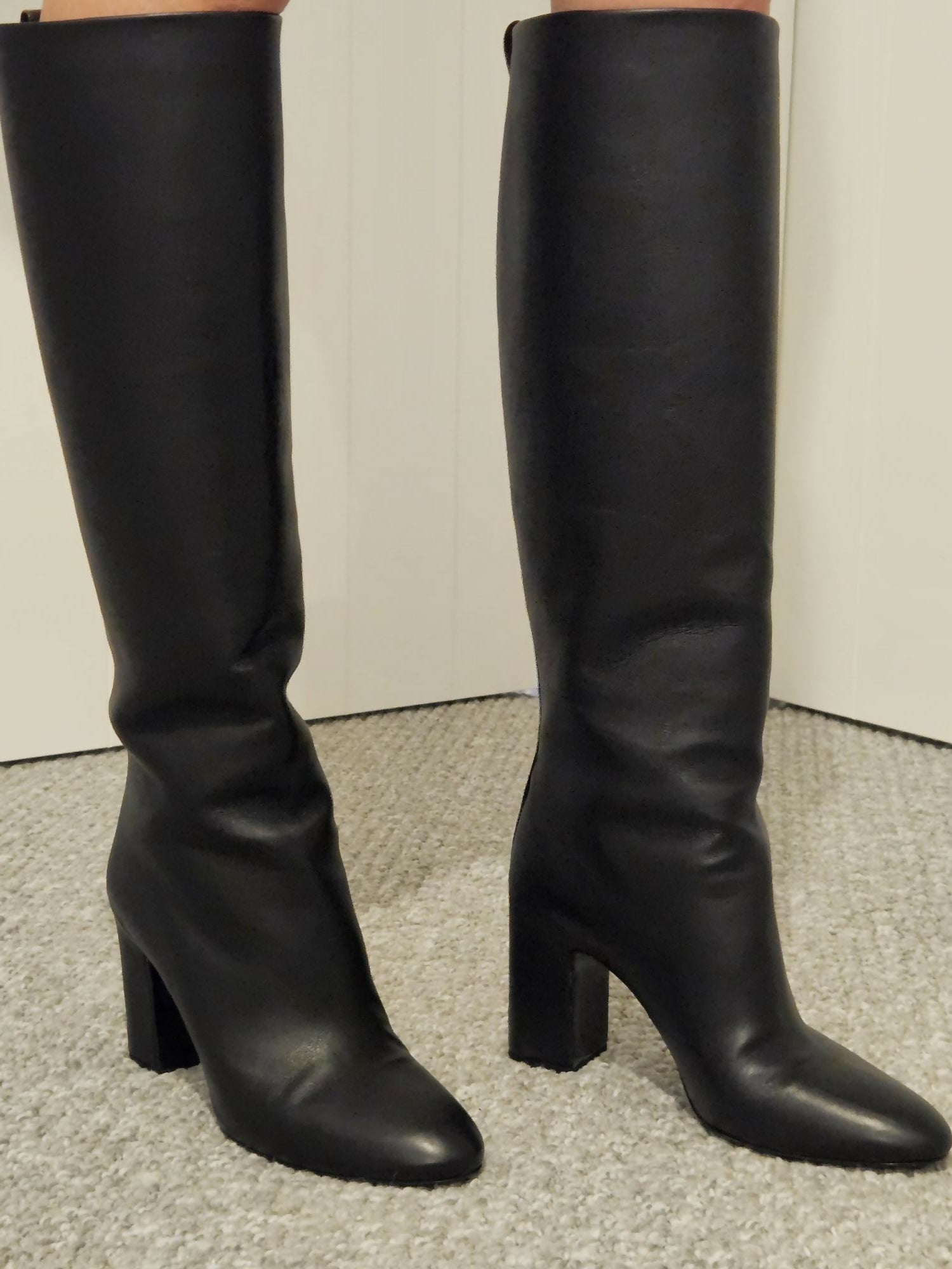 Worn once out for dinner, perfect condition, no marks or scratches, sole has signs of wear but heel cap is near perfect. Size 38 im a 7.5 and these fit perfectly. really nice fit around the calf and not too slouch at the ankle. my calf measurement is 34cm.