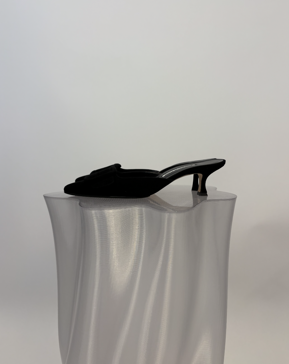 An enduring icon of understated glamour, Manolo Blahnik’s Maysale 50 mules are crafted from soft black suede and accented with the designer’s signature buckle. With a comfortable mid-height heel, this silhouette exudes effortless sophistication. This pair is free of flaws, maintaining immaculate condition throughout. A commercial receipt (printout) is included. A timeless Manolo classic — feminine, versatile, and impeccably crafted.